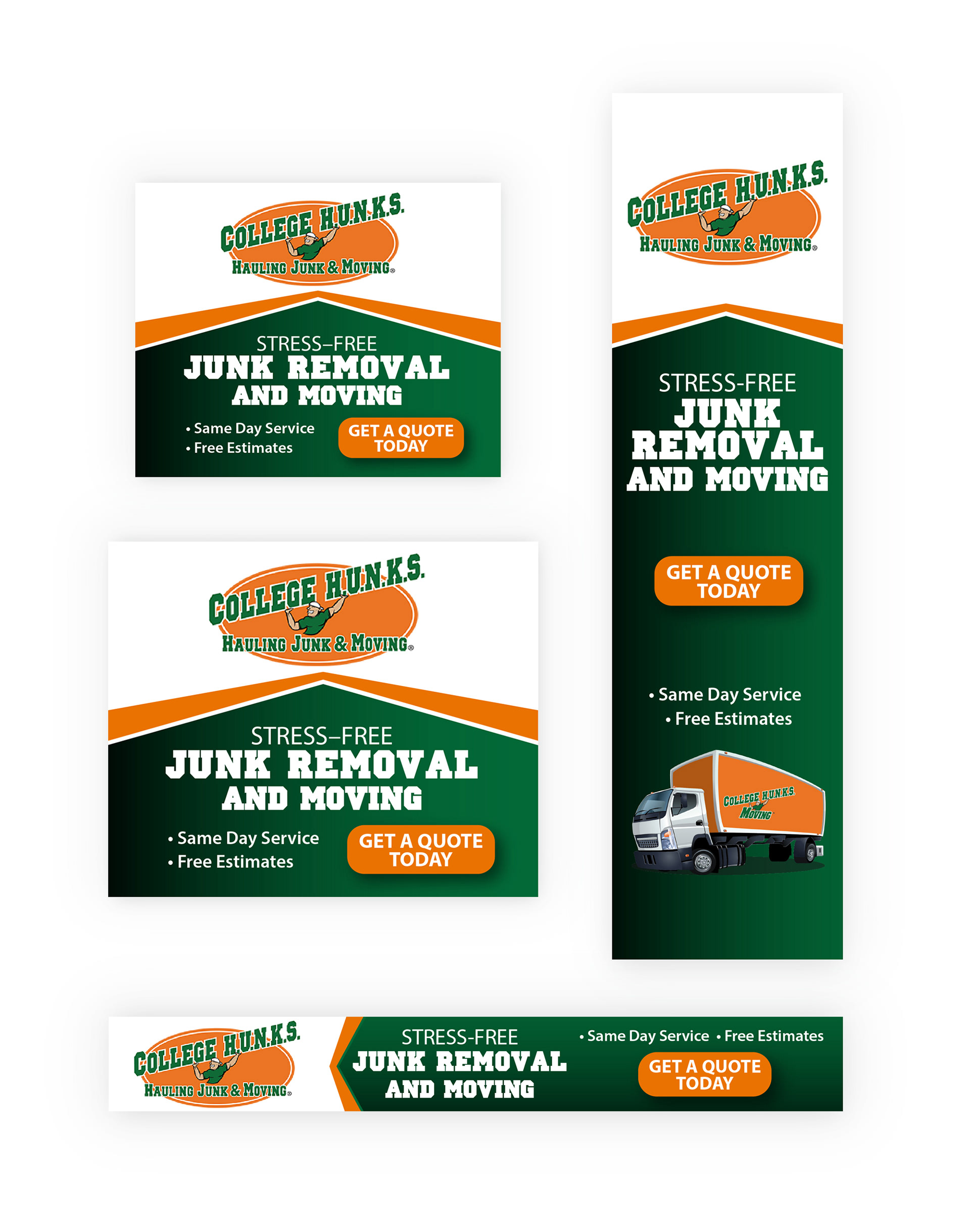 College Hunks Hauling Junk, as seen on ABC’s Shark Tank in 2008, offers stress-free moving and junk removal services. The company’s Seattle-based digital marketing agency, Chair 10 Marketing, reached out and asked me to mockup a series of digital ad sets that they could present to College Hunks. Supplied with brand guidelines, the directive was to create sets of simple, clutter-free ads that would encourage prospects to get a quote. I was also asked to explore inventive ways to use the brand's color palette and utilize the key brand assets to help strengthen their positioning in the market place.