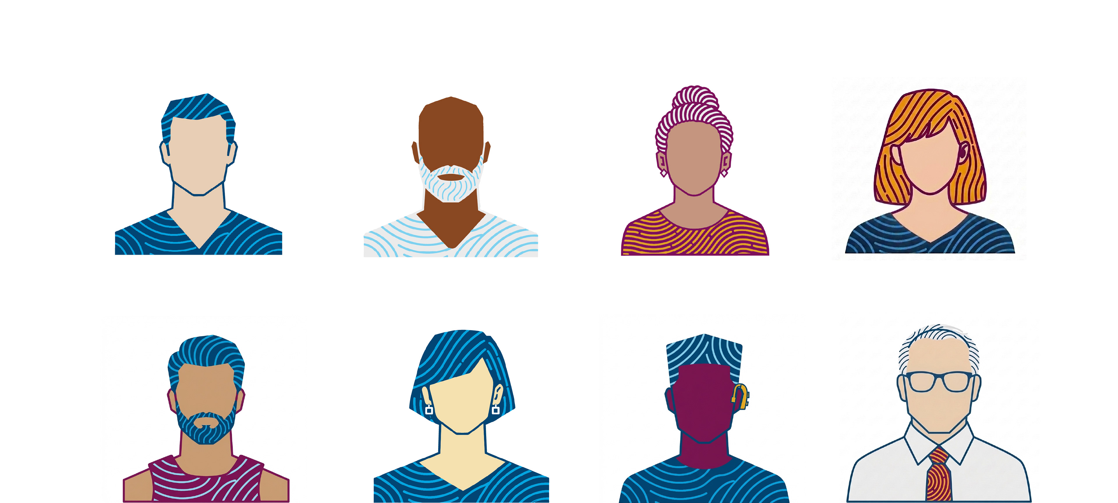 I created a base avatar using sharp lines and angles combined with rounded corners used sparingly. I then used generative AI to add the brand's circular pattern to the hair and clothing. I then used the AI to scale production, creating a series of Avatars based on the compiled image. I then brought the images back into Illustrator for manual refinements on colors and line weights.